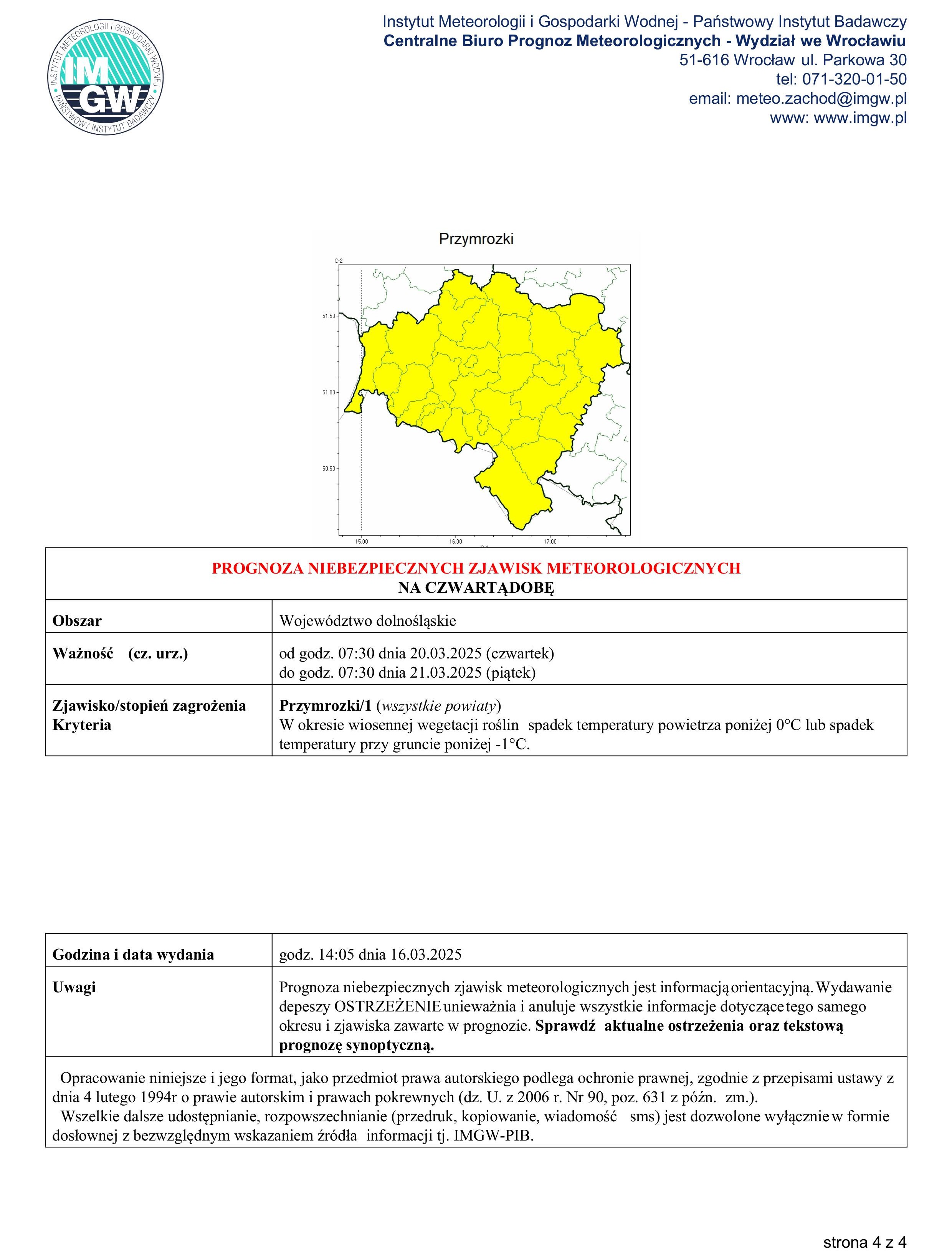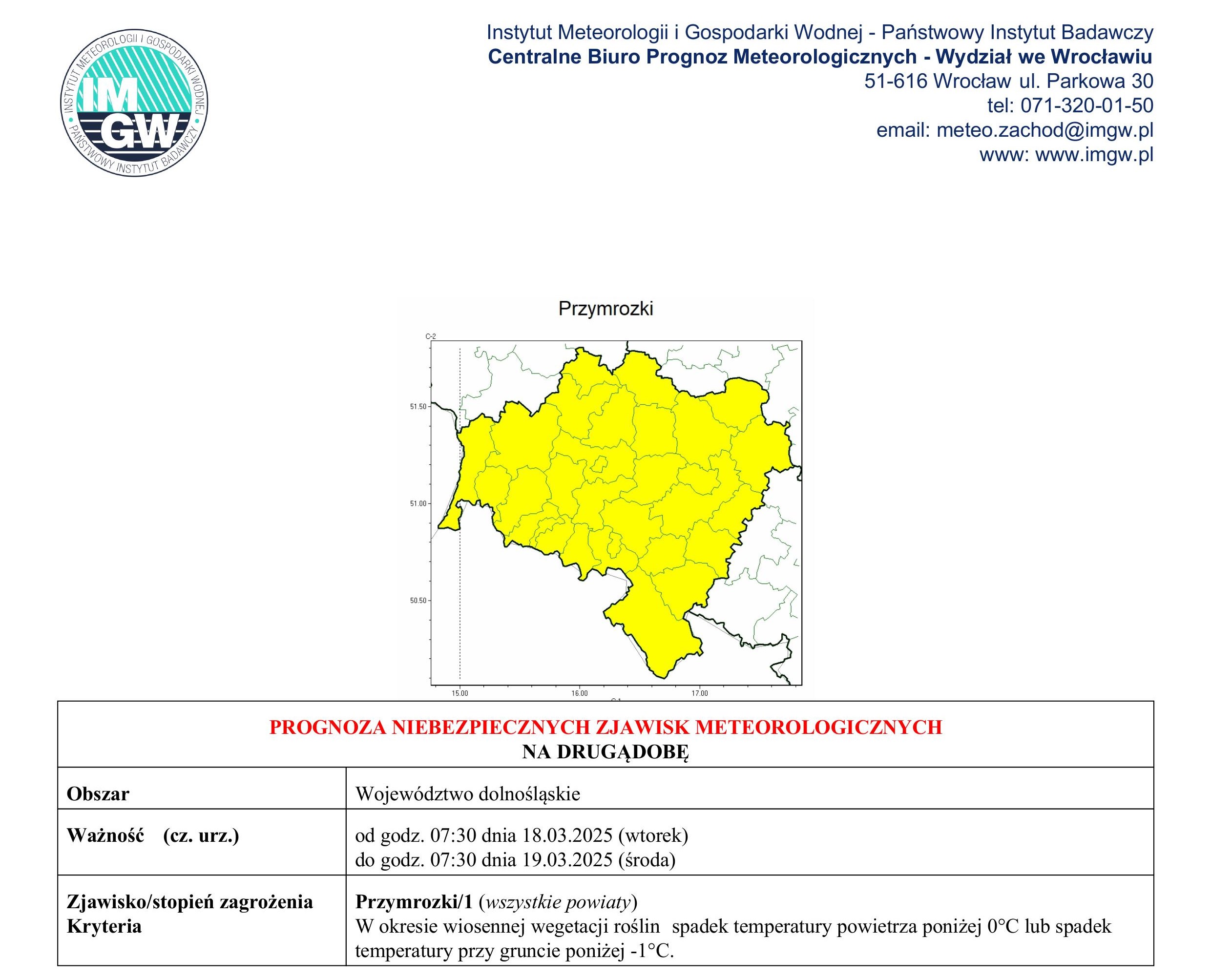 Opis: W godzinach nocnych i porannych przewidywany jest spadek temperatury powietrza poniżej 0°C, a przy gruncie poniżej -1°C.