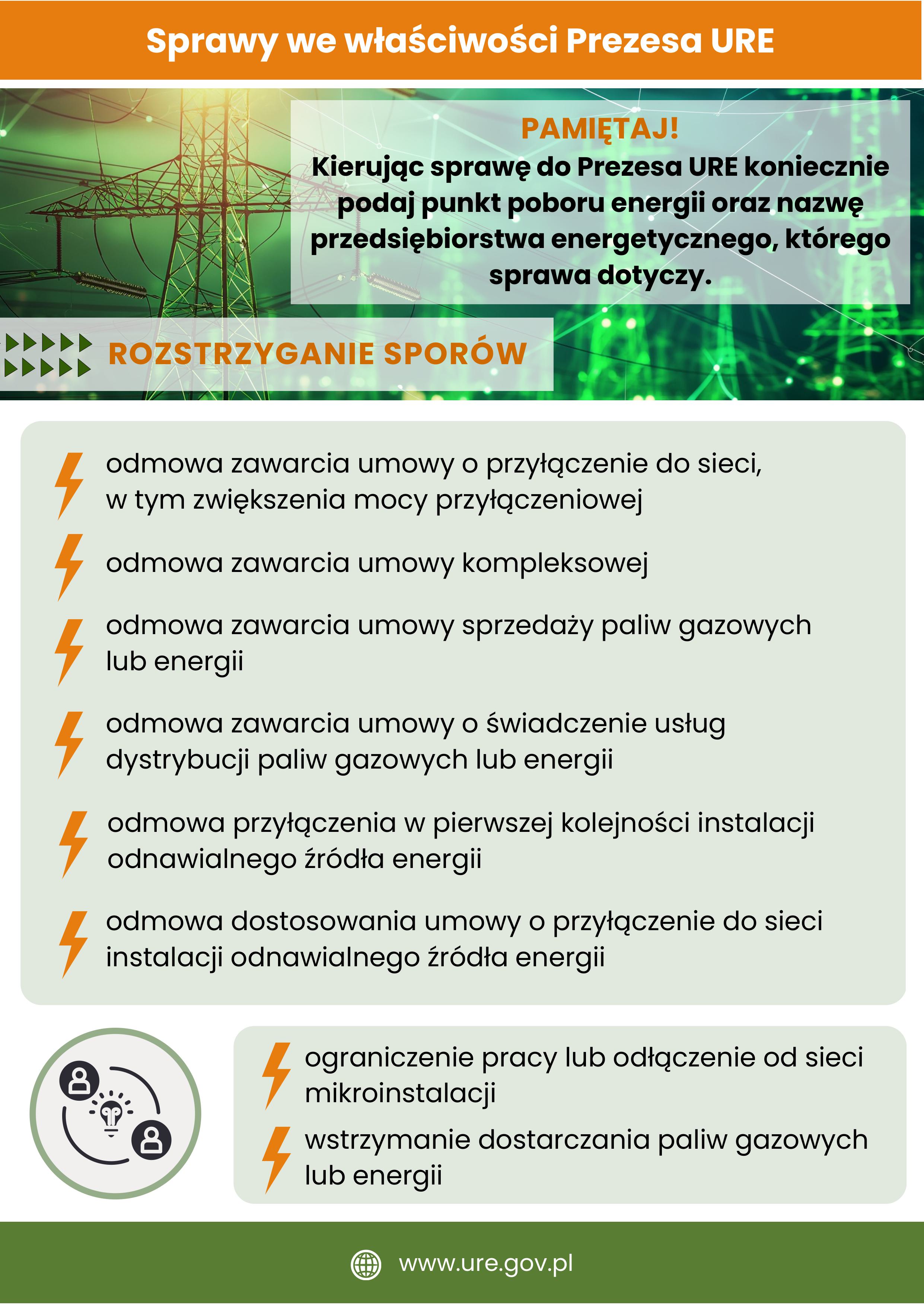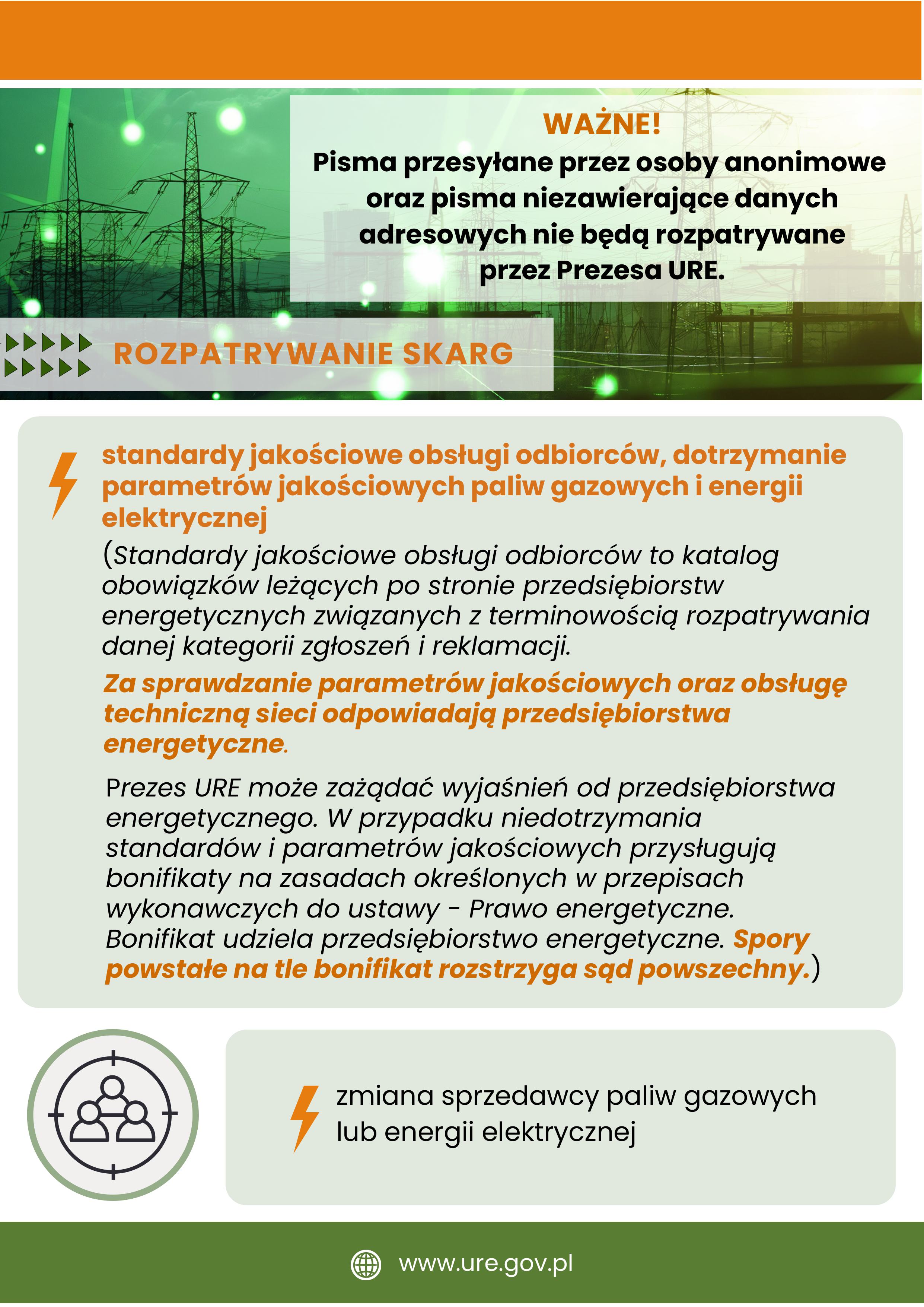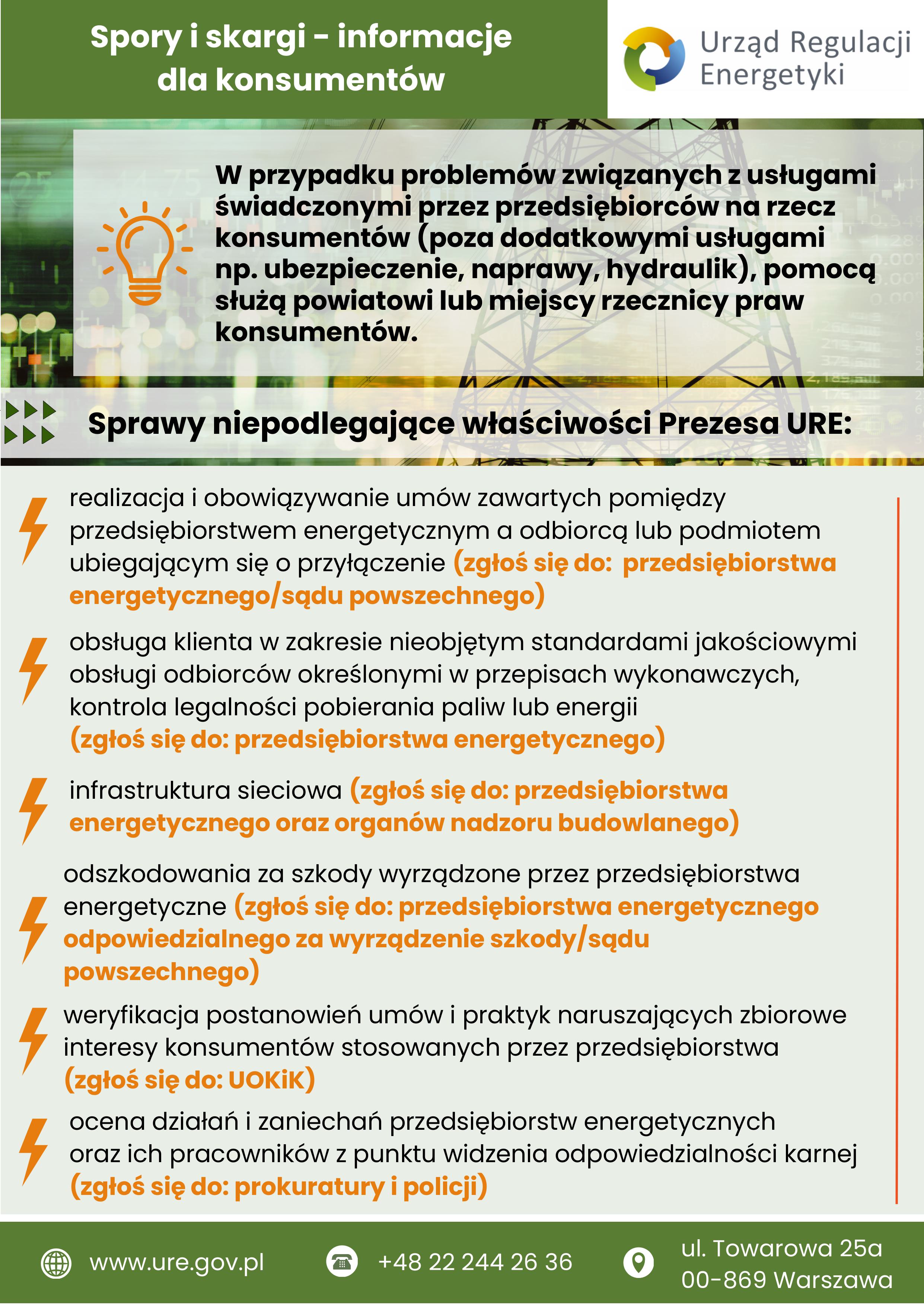 Zachęcamy Państwa do zapoznania się z praktycznym poradnikiem dla konsumentów - odbiorców energii – na temat sporów i skarg na działalność przedsiębiorstw energetycznych, zamieszczonym na stronie Urzędu Regulacji Energetyki oraz zamieszczoną poniżej broszurą informacyjną, która w sposób przejrzysty i kompleksowy wyjaśnia z jakimi sporami i skargami można zwrócić się do URE oraz gdzie zgłaszać skargi, które są poza właściwością Regulatora.