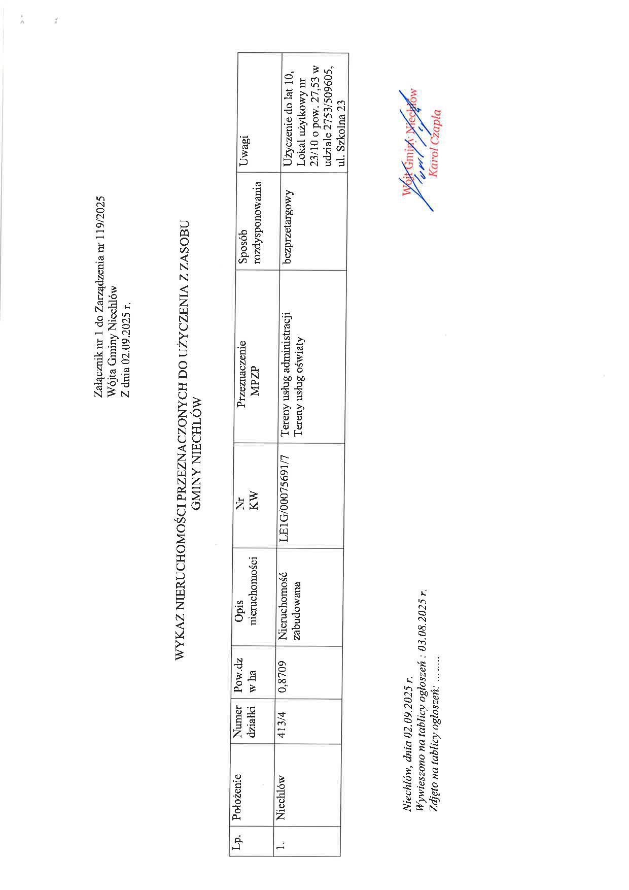 ZARZĄDZENIE NR 119/2025 WÓJTA GMINY NIECHLÓW Z DNIA 02.09.2025 R. W SPRAWIE PRZEZNACZENIA ODDANIA W UŻYCZENIE NIERUCHOMOŚCI STANOWIĄCEJ WŁASNOŚĆ GMINY NIECHLÓW