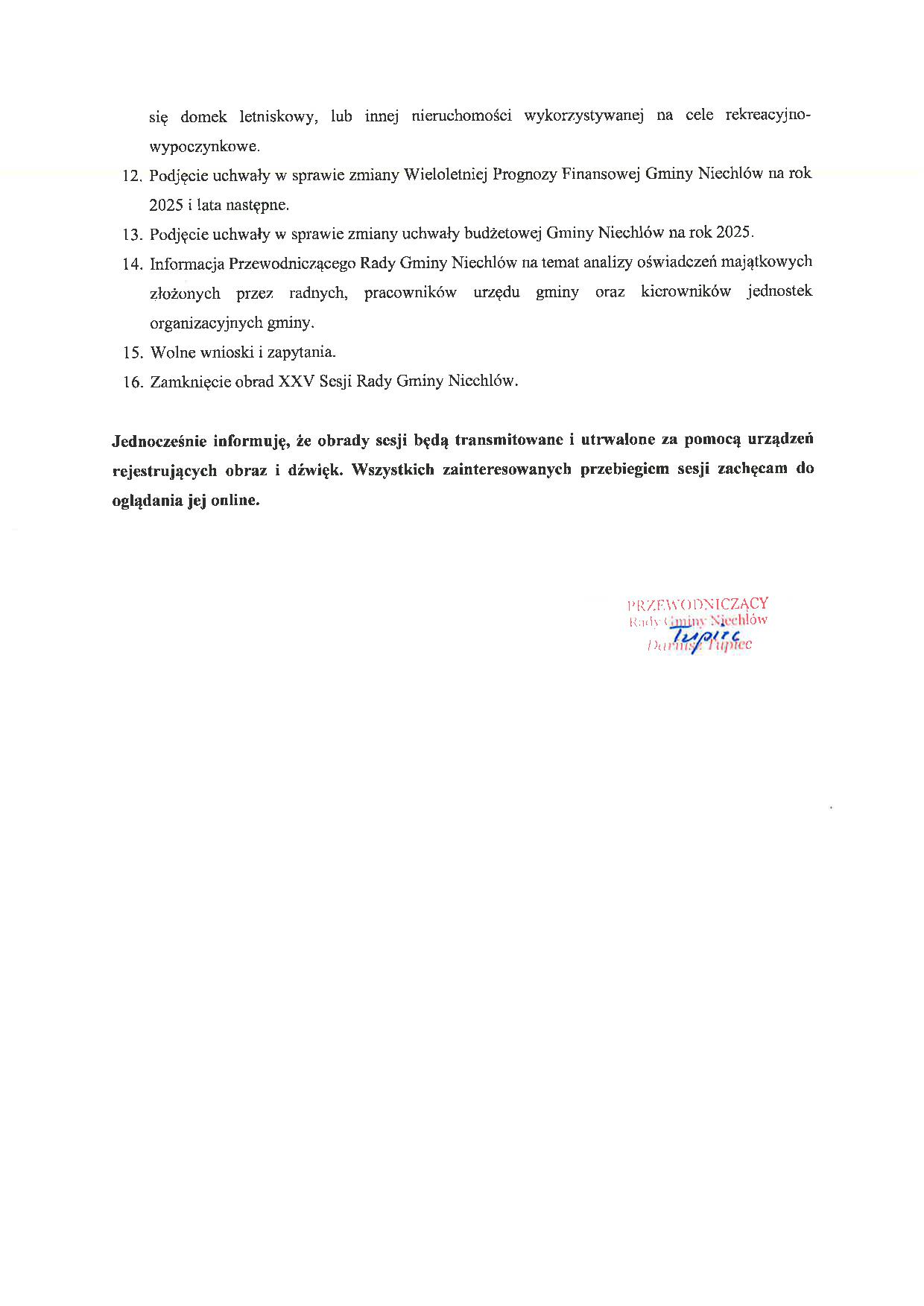 ZAWIADOMIENIE O XXV SESJI RADY GMINY NIECHLÓW