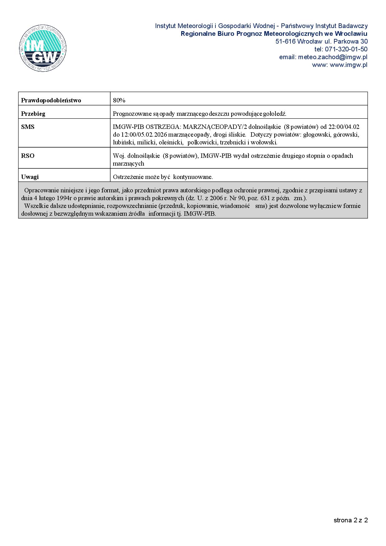 Instytut Meteorologii i Gospodarki Wodnej - IMGW PIB wydał ostrzeżenie drugiego stopnia o opadach marznących dla powiatu górowskiego. Prosimy o zachowanie ostrożności i zachęcamy do zapoznania się z informacją meteorologiczną.