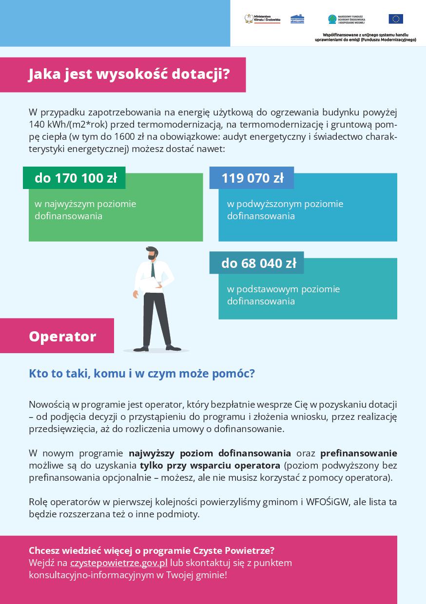 Gmina oferuje mieszkańcom bezpłatną, pełną obsługę na każdym etapie ubiegania się o dofinansowanie. Jako operator poprowadzi „za rękę” beneficjenta przez całą ścieżkę w programie Czyste Powietrze. To pełna opieka i wsparcie od podjęcia decyzji o realizacji inwestycji, przez proces inwestycyjny, aż do jego zakończenia i rozliczenia umowy o dofinansowanie. Rolą operatorów jest wsparcie beneficjentów najwyższego i podwyższonego poziomu dofinansowania.