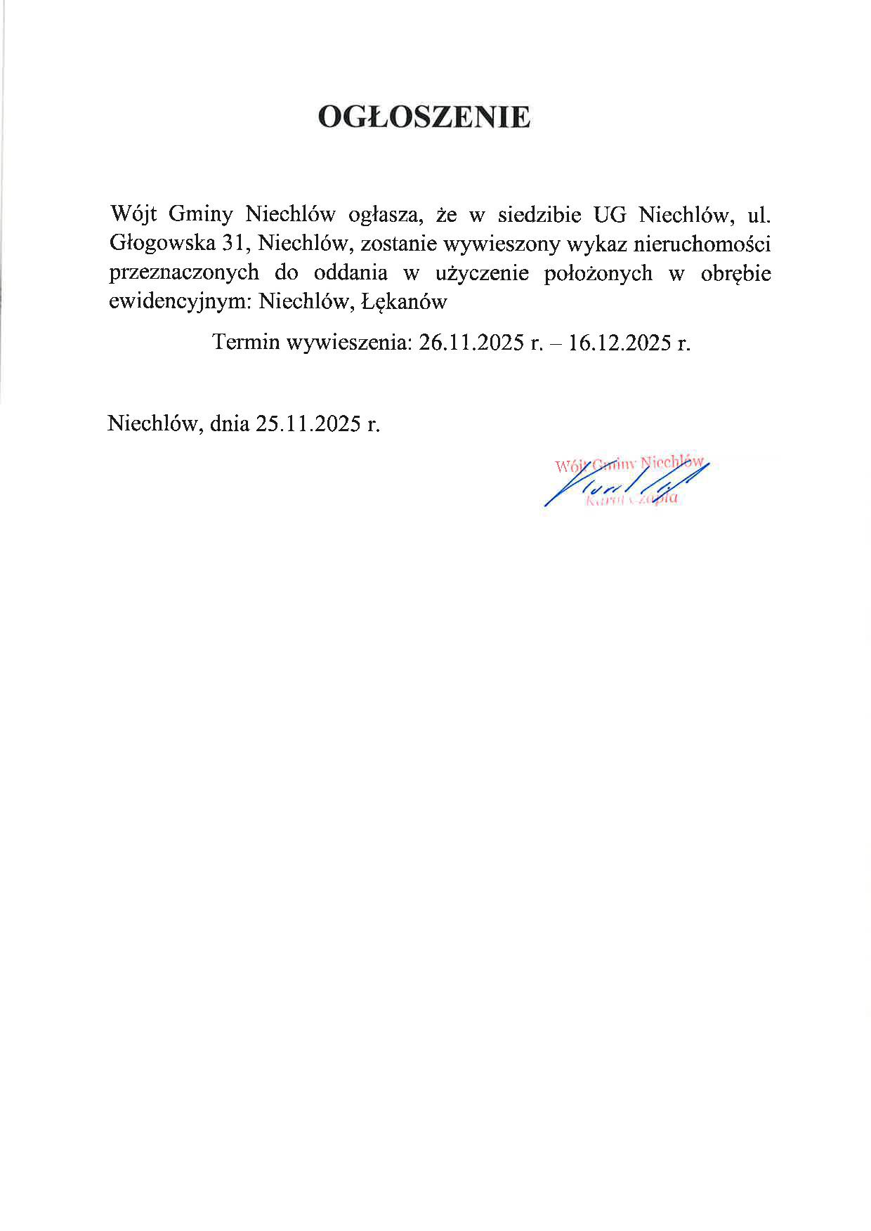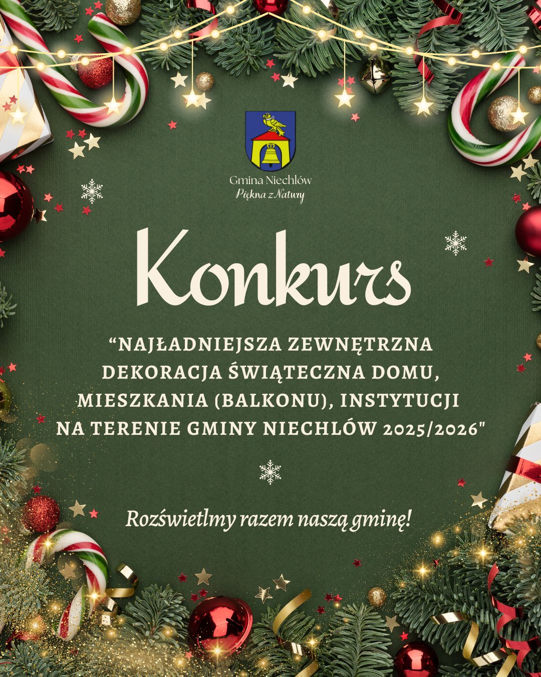 Wójt Gminy Niechlów Karol Czapla zaprasza do udziału w konkursie pn.: „Najładniejsza zewnętrzna dekoracja świąteczna domu (posesji), mieszkania (balkonu), instytucji na terenie Gminy Niechlów 2025/2026 ”! To wyjątkowa okazja, aby zaprezentować swoje świąteczne iluminacje, które rozświetlą zimowe wieczory i podkreślą magię Bożego Narodzenia. Najpiękniejsze dekoracje zostaną nagrodzone! 🎁🎄