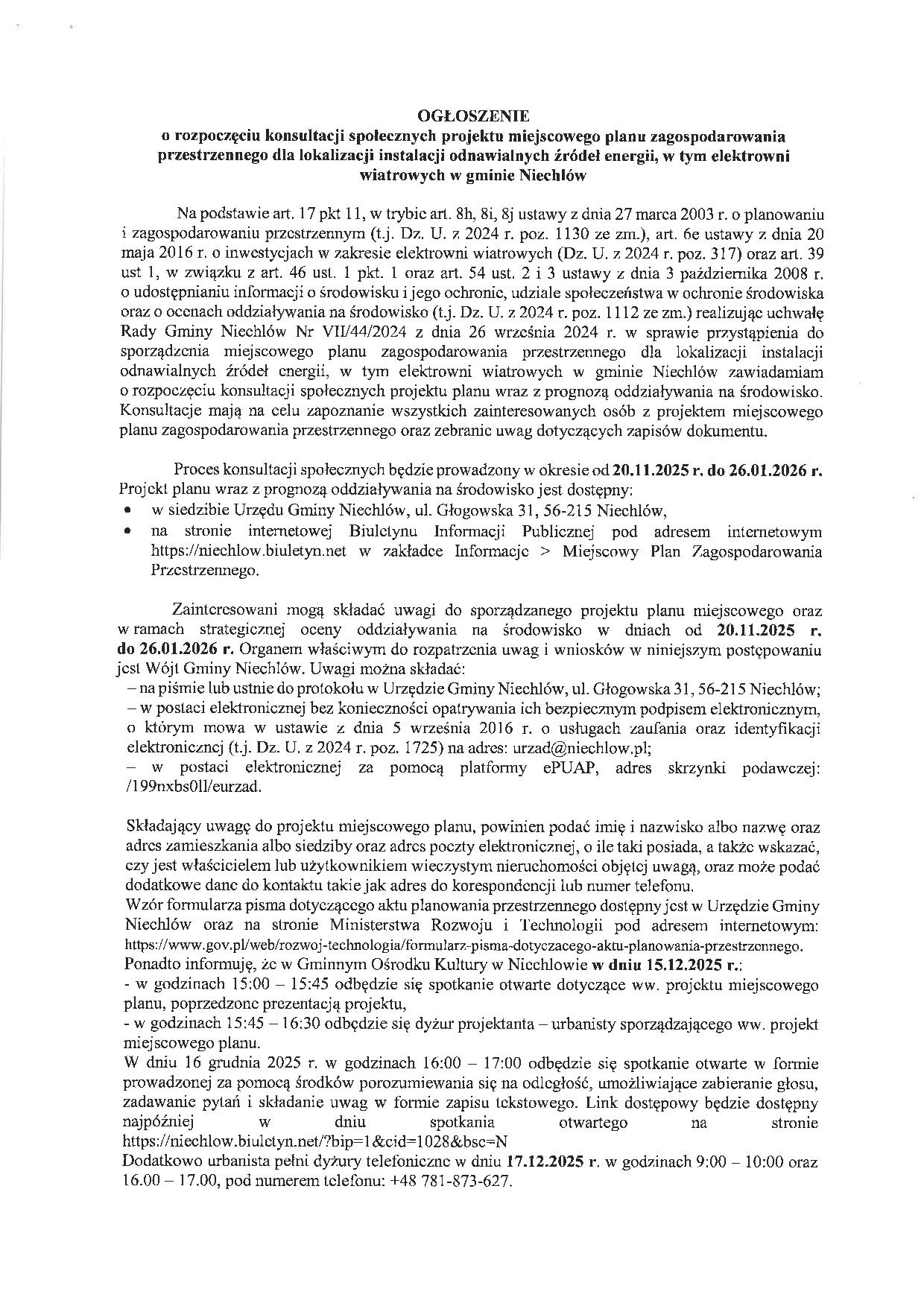 O ROZPOCZĘCIU KONSULTACJI SPOŁECZNYCH PROJEKTU MIEJSCOWEGO PLANU ZAGOSPODAROWANIA PRZESTRZENNEGO DLA LOKALIZACJI INSTALACJI ODNAWIALNYCH ŹRÓDEŁ ENERGII, W TYM ELEKTROWNI WIATROWYCH W GMINIE NIECHLÓW: