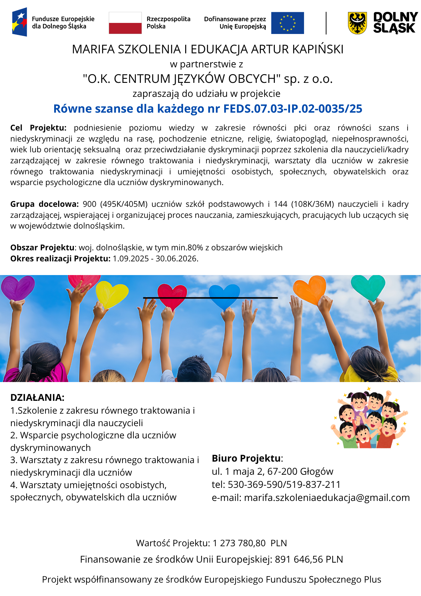 🎓 „Marifa Szkolenia i Edukacja” Artur Kapiński w partnerstwie z „O.K. Centrum Języków Obcych” sp. z o.o. zapraszają do udziału w projekcie wspierającym równość i przeciwdziałanie dyskryminacji w szkołach podstawowych.