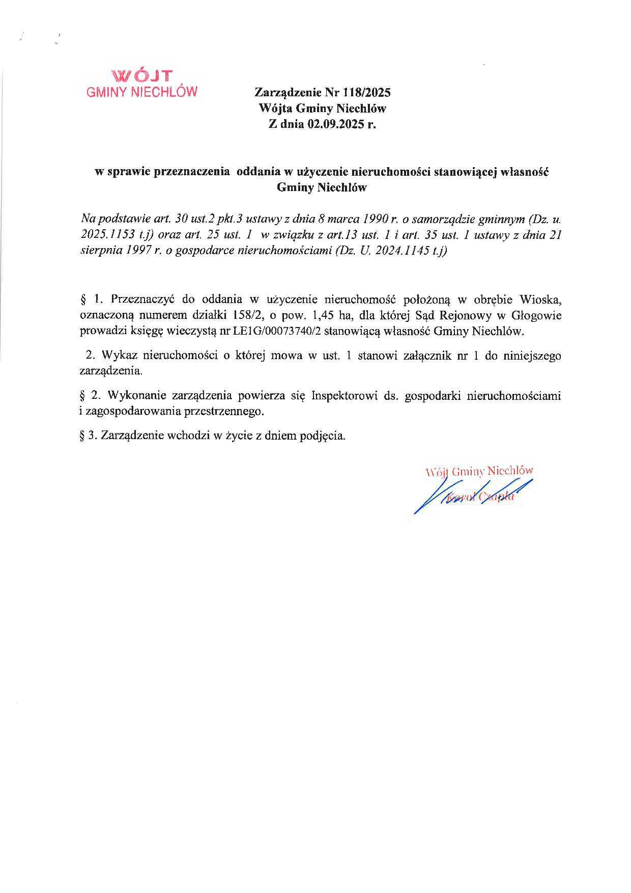 ZARZĄDZANIE NR 118/2025 WÓJTA GMINY NIECHLÓW Z DNIA 02.09.2025 R. W SPRAWIE PRZEZNACZENIA ODDANIA W UŻYCZENIE NIERUCHOMOŚCI STANOWIĄCEJ WŁASNOŚĆ GMINY NIECHLÓW