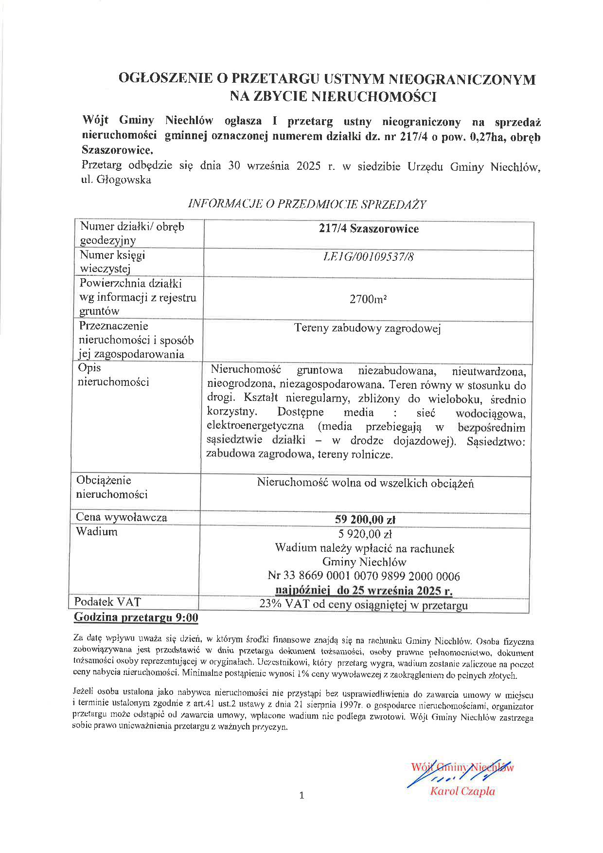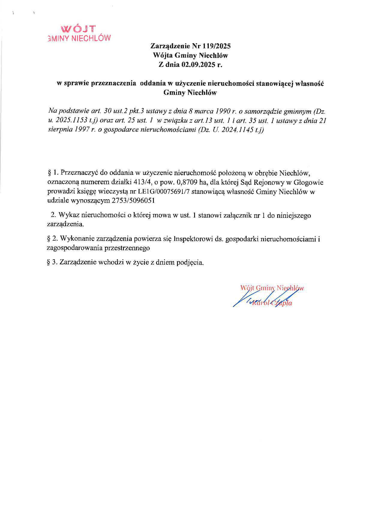 ZARZĄDZENIE NR 119/2025 WÓJTA GMINY NIECHLÓW Z DNIA 02.09.2025 R. W SPRAWIE PRZEZNACZENIA ODDANIA W UŻYCZENIE NIERUCHOMOŚCI STANOWIĄCEJ WŁASNOŚĆ GMINY NIECHLÓW