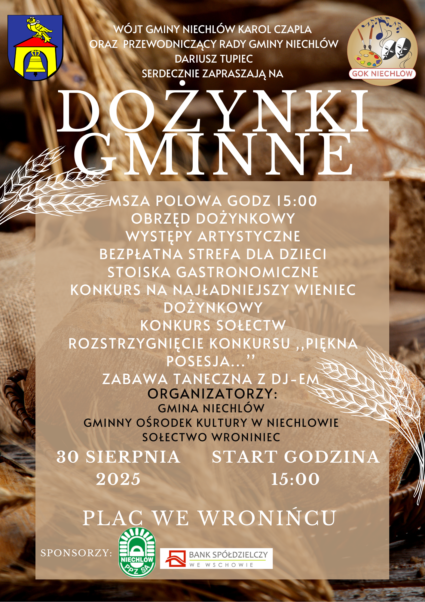 Wójt Gminy Niechlów Karol Czapla wraz z Przewodniczącym Rady Gminy Dariuszem Tupcem serdecznie zapraszają na niezapomniane Dożynki Gminne już 30 sierpnia 2025 r.!