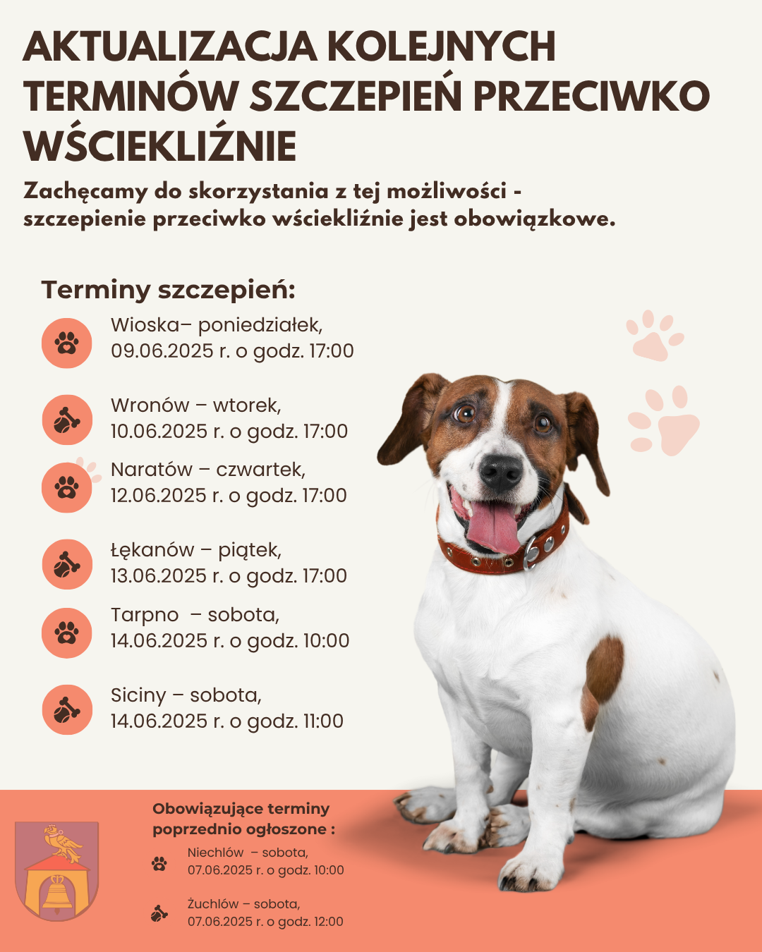 Mamy dla Was nowe informacje dotyczące kolejnych terminów szczepień przeciwko wściekliźnie na terenie naszej Gminy. Jeśli planujecie skorzystać, koniecznie zapoznajcie się z harmonogramem!