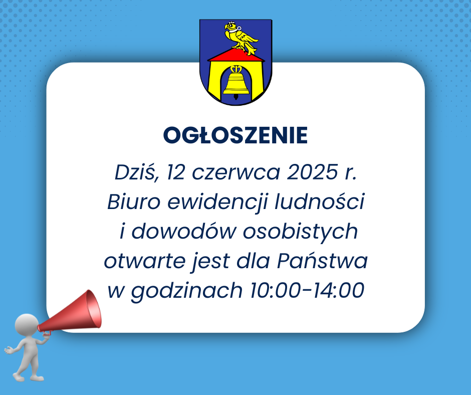 Zapraszamy do załatwienia wszelkich spraw urzędowych w wyznaczonych godzinach! Biuro ewidencji ludności i dowodów osobistych jest dziś otwarte w godzinach 10:00 - 14:00.