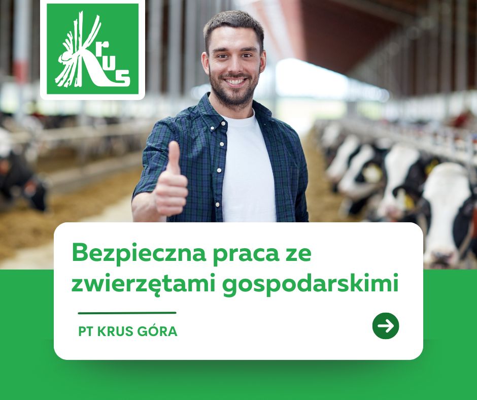 PT KRUS Góra wydał publikację dla rolników pn.: "Bezpieczna praca ze zwierzętami gospodarskimi", w której zebrano najważniejsze zasady bezpiecznej obsługi zwierząt oraz wskazano najczęstsze zagrożenia w gospodarstwach. Materiał w prosty sposób przypomina, że znajomość zachowań zwierząt i właściwa organizacja pracy znacząco zmniejszają ryzyko wypadków.