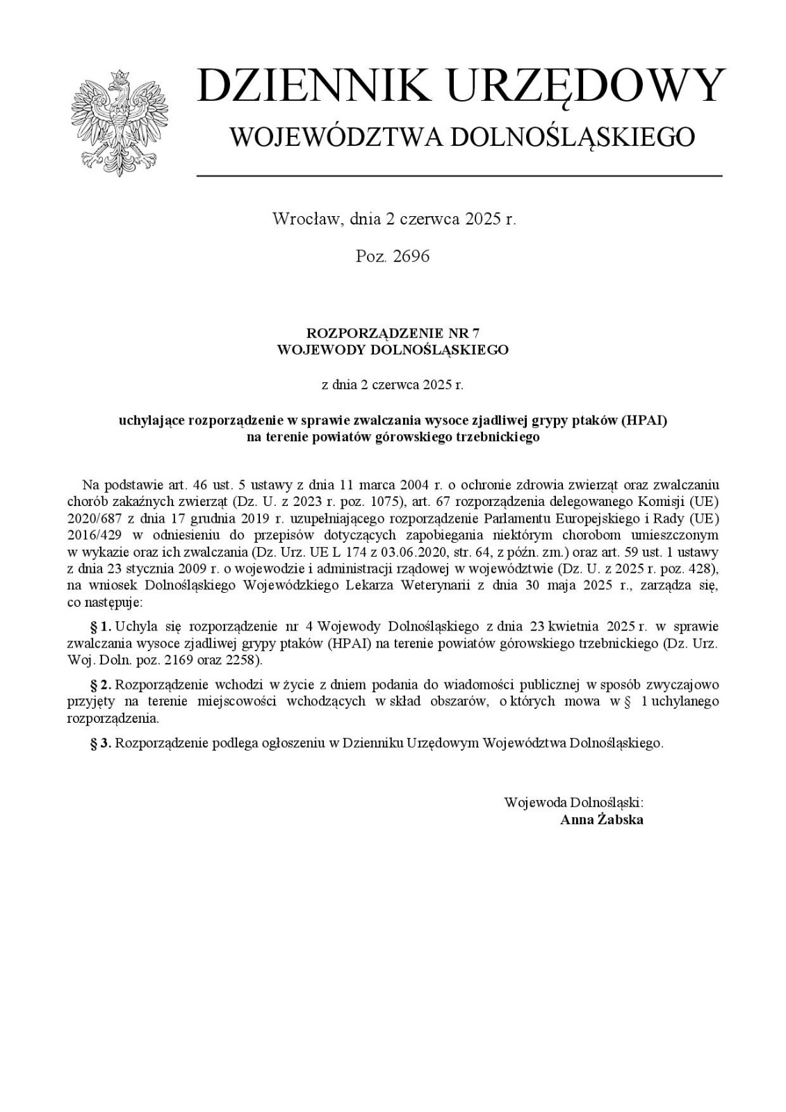 Wojewoda Dolnośląski wydał Rozporządzenie nr 7 z dnia 2 czerwca 2025 r., które uchyla przepisy dotyczące zwalczania wysoce zjadliwej grypy ptaków (HPAI) na naszym terenie.