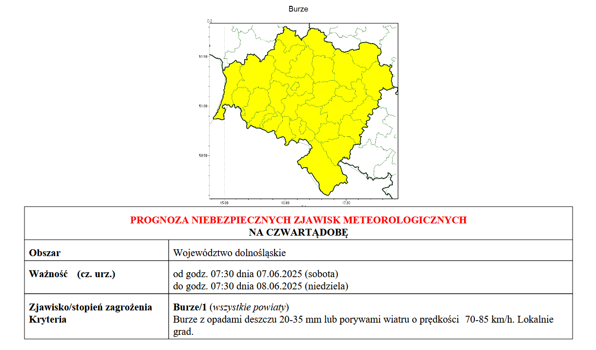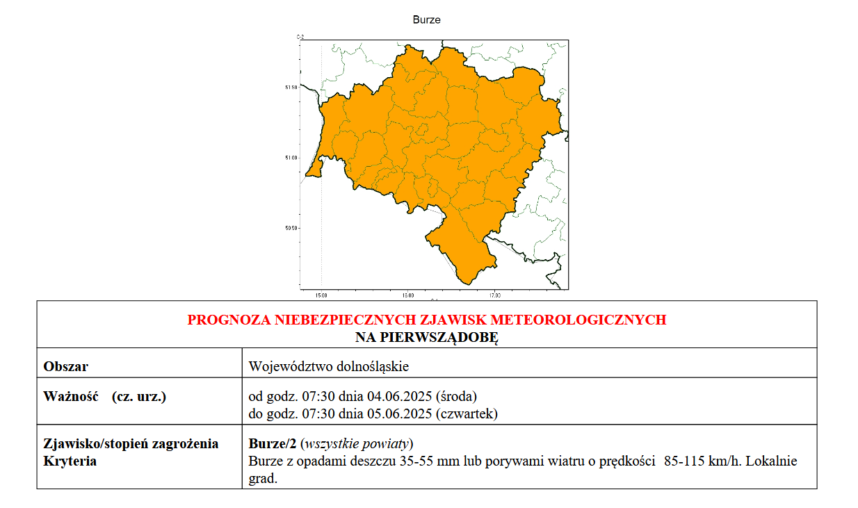 Instytut Meteorologii i Gospodarki Wodnej wydał ostrzeżenie dla naszego regionu. Prosimy o zachowanie ostrożności i monitorowanie sytuacji pogodowej.