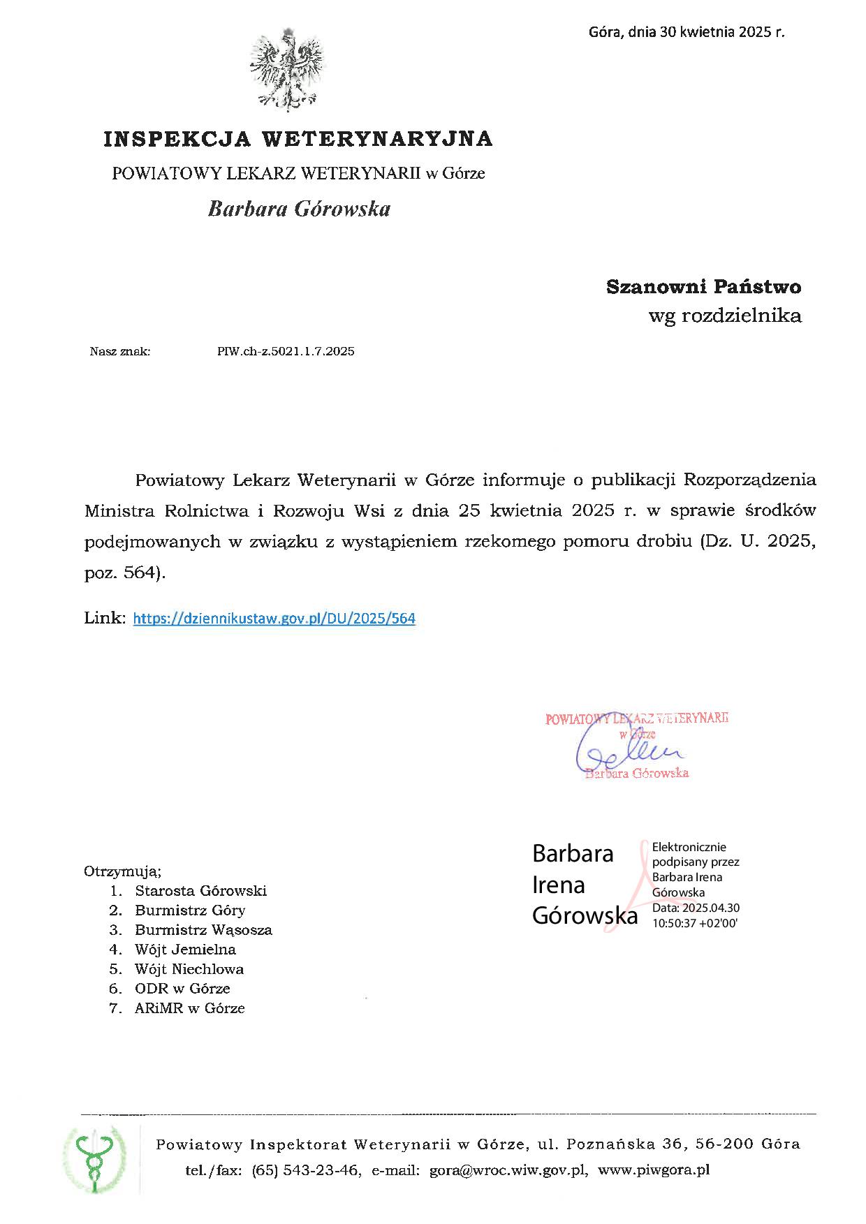 z dnia 25.04.2025r. w sprawie środków podejmowanych w związku z wystąpieniem rzekomego pomoru drobiu.