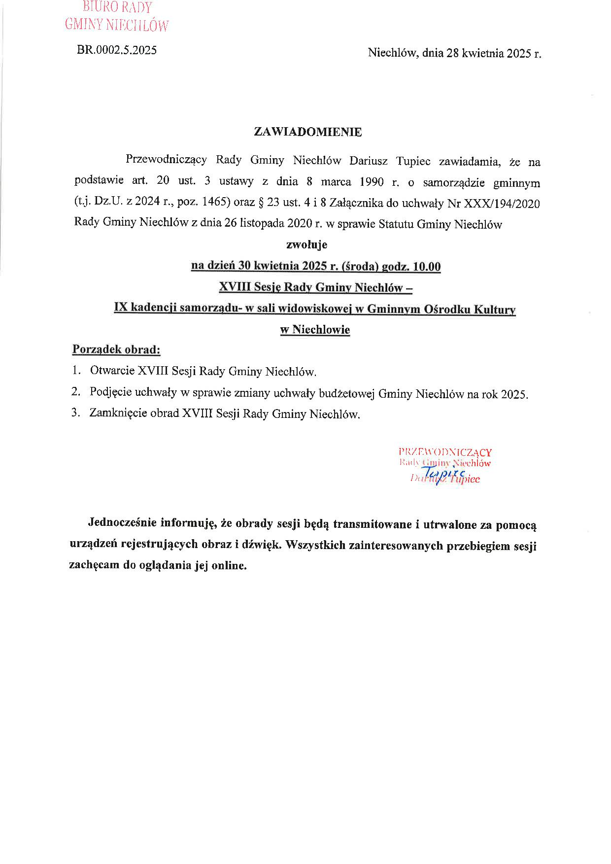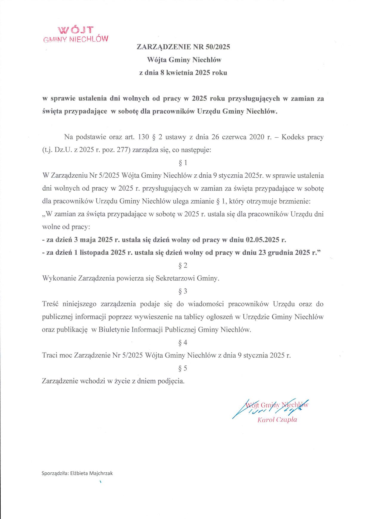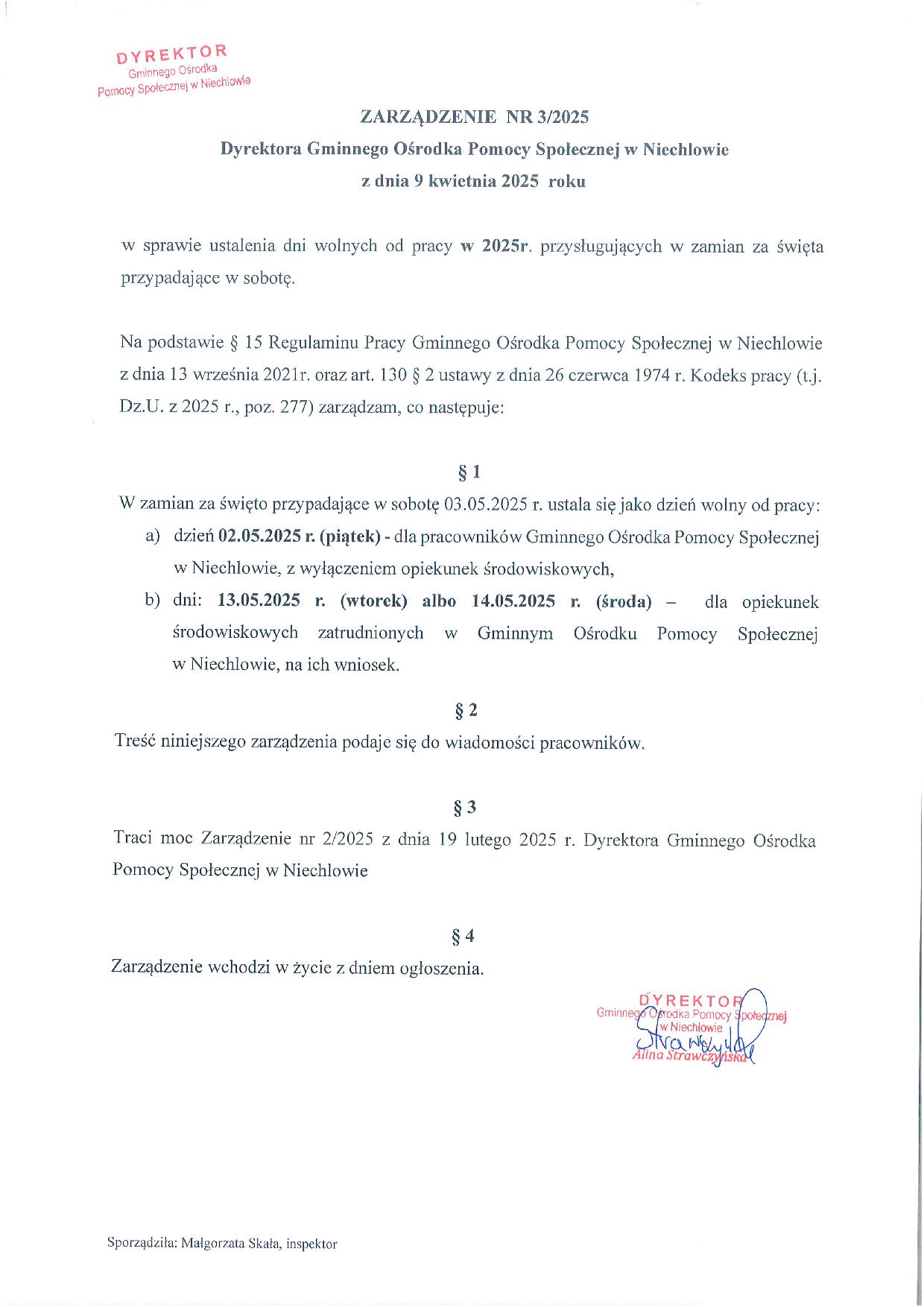 📍Informujemy, że zgodnie z Zarządzeniem nr 50/2025 Wójta Gminy Niechlów z dnia 8 kwietnia 2025 roku, w sprawie ustalenia dni wolnych od pracy w zamian za święta przypadające w sobotę oraz Zarządzenia nr 3/2025 Dyrektora Gminnego Ośrodka Pomocy Społecznej w Niechlowie z dnia 9 kwietnia 2025 roku, w sprawie dni wolnych od pracy w 2025 roku przysługujących w zamian za święta przypadające w sobotę, dla pracowników Urzędu Gminy Niechlów oraz Gminnego Ośrodka Pomocy Społecznej ustalono dzień wolny od pracy: