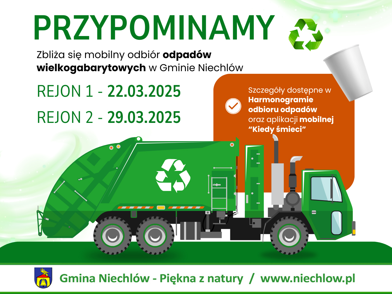 Szanowni mieszkańcy, przypominamy, że w dn. 22 oraz 29 marca odbywać się będzie mobilny odbiór odpadów wielkogabarytowych zgodnie z Harmonogramem odbioru odpadów.