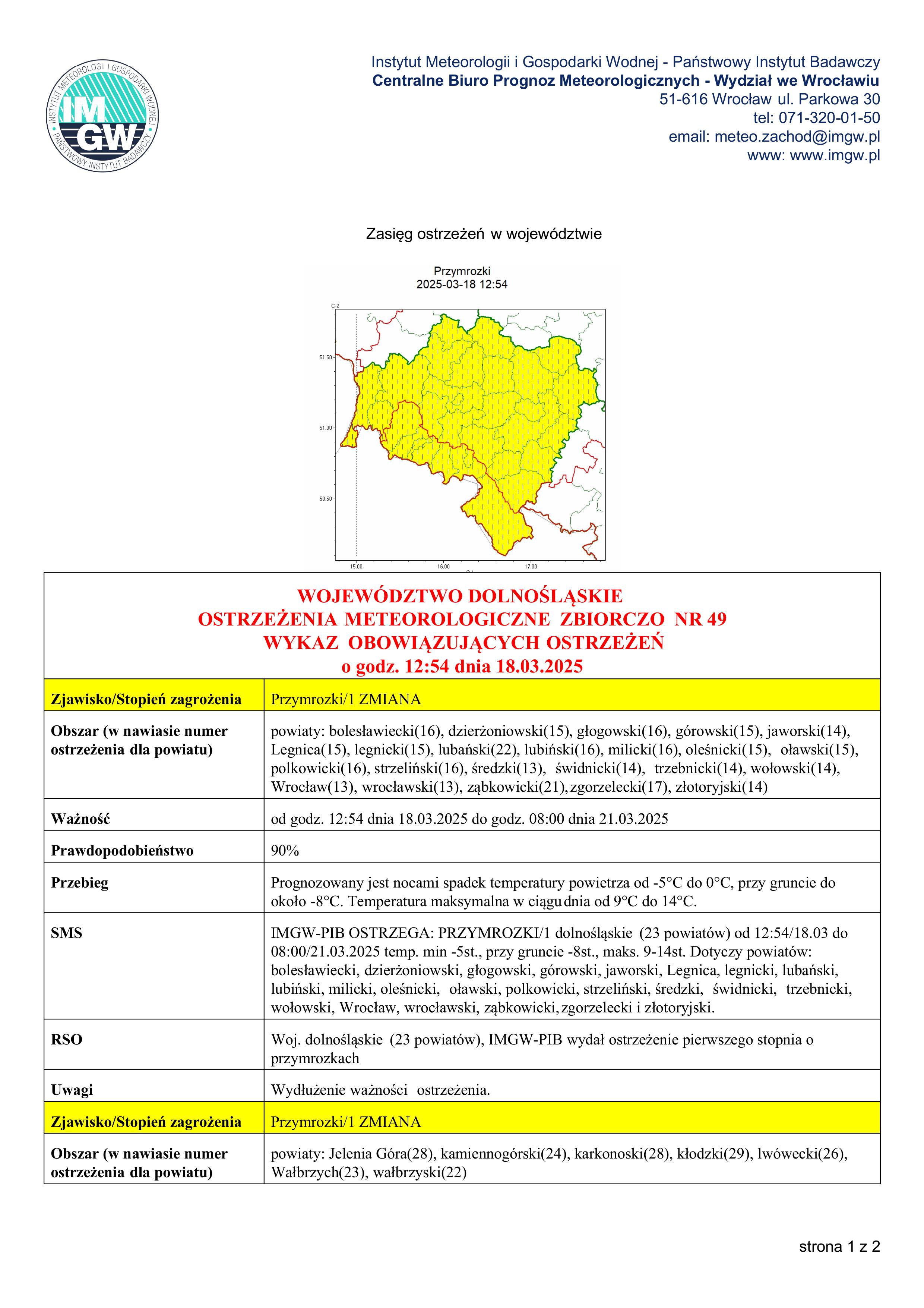 IMGW-PIB wydał ostrzeżenie meteorologiczne pierwszego stopnia dla naszego regionu dotyczące przymrozków. Ostrzeżenie obowiązuje od godz. 12:54 dnia 18 marca 2025 r. do godz. 08:00 dnia 21 marca 2025 r.