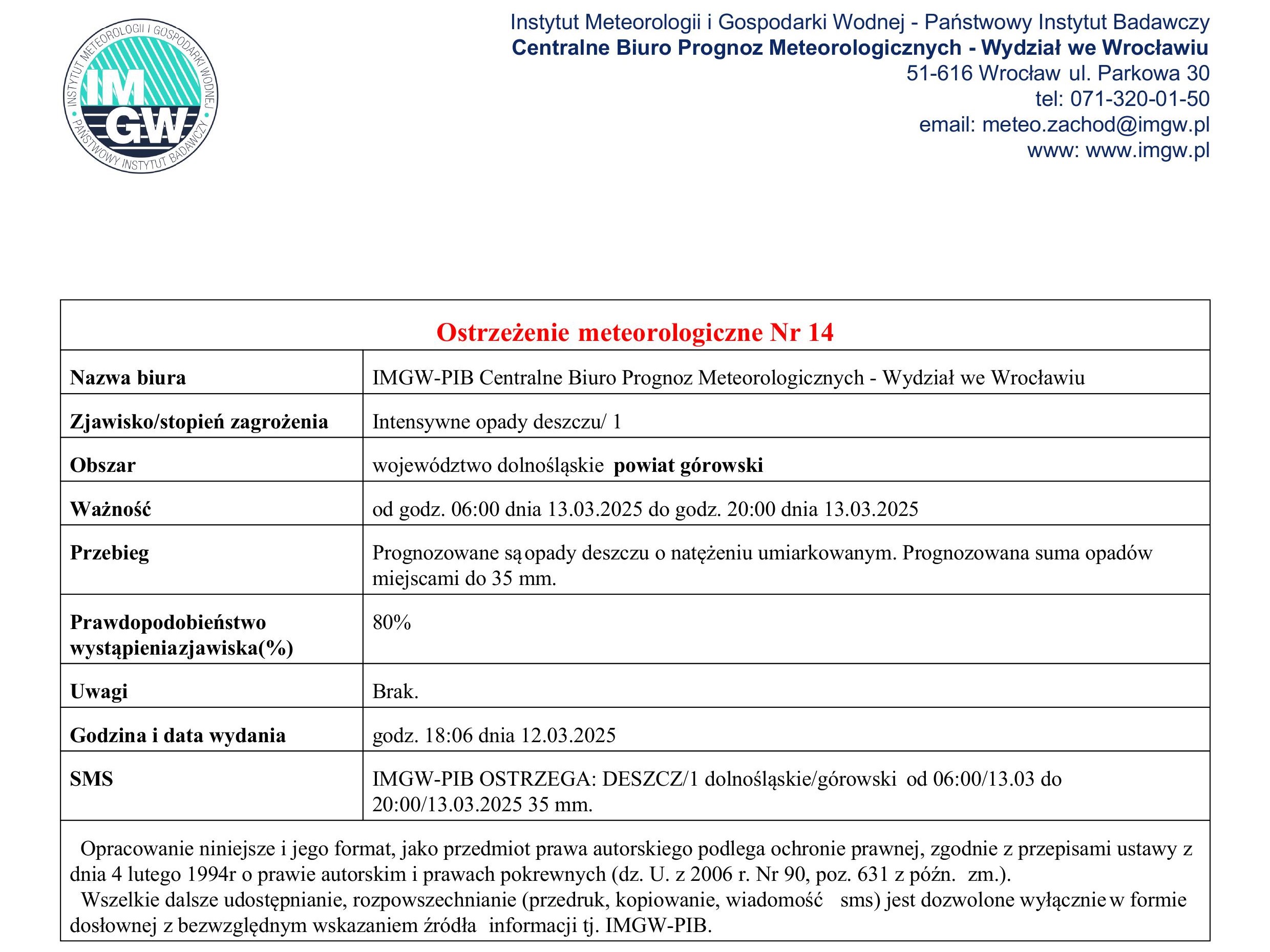 Ważność: 13 marca 2025 r. (czwartek) od godz. 06:00 do godz. 20:00