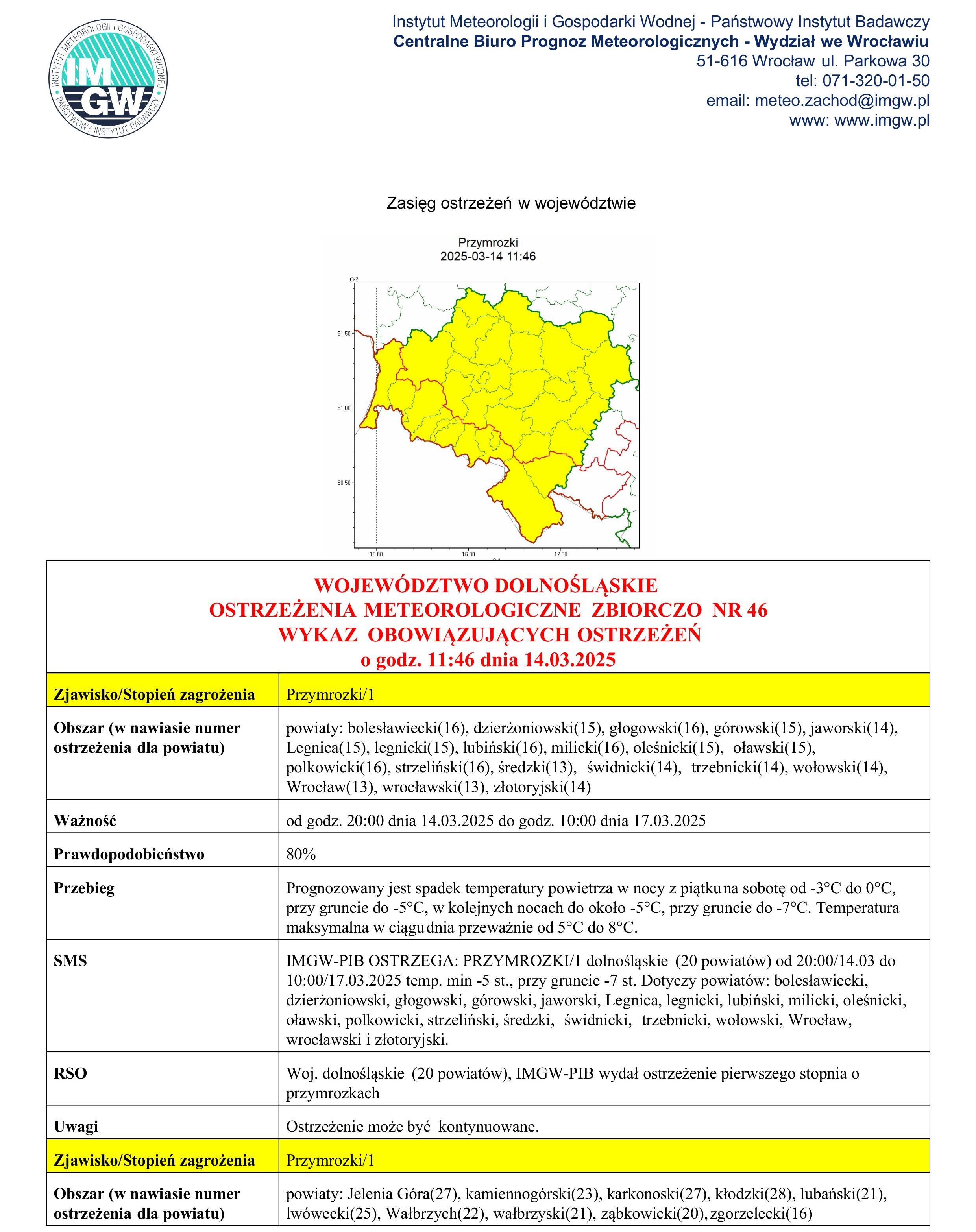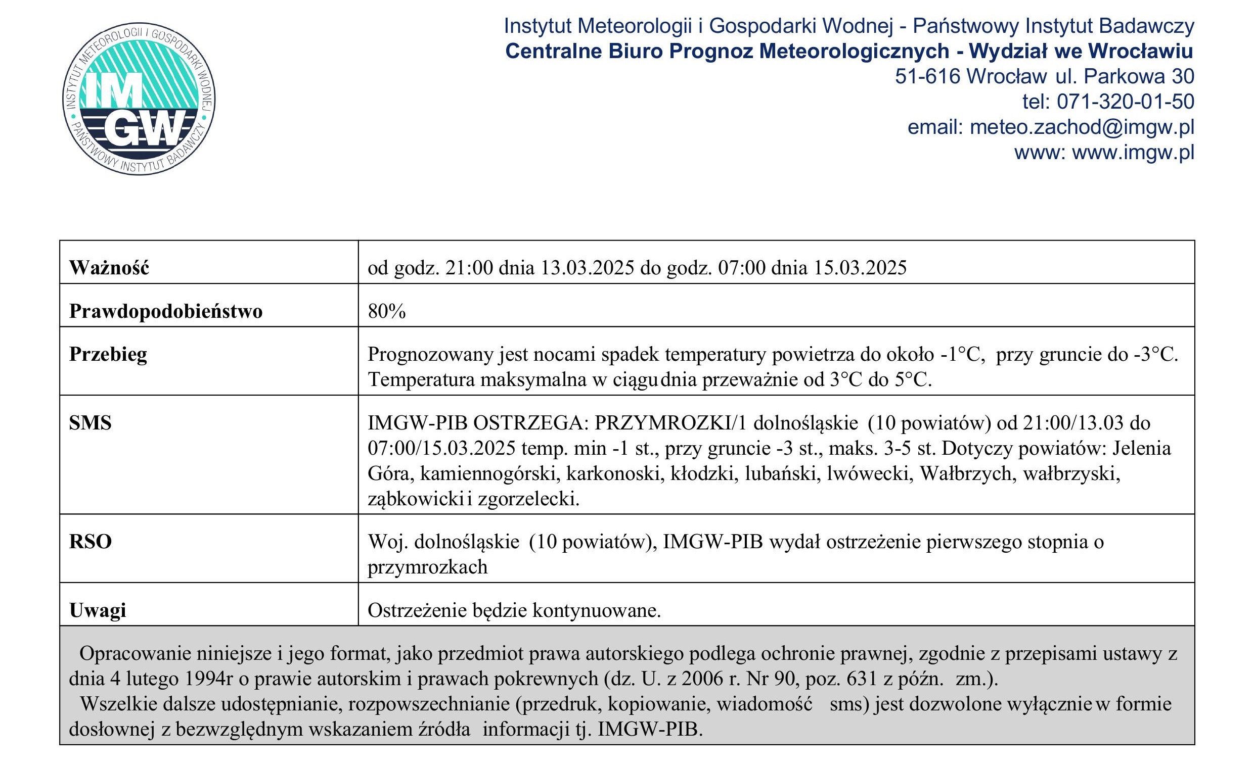 Instytut Meteorologii i Gospodarki Wodnej wydał ostrzeżenie dla województwa dolnośląskiego dotyczące przymrozków.