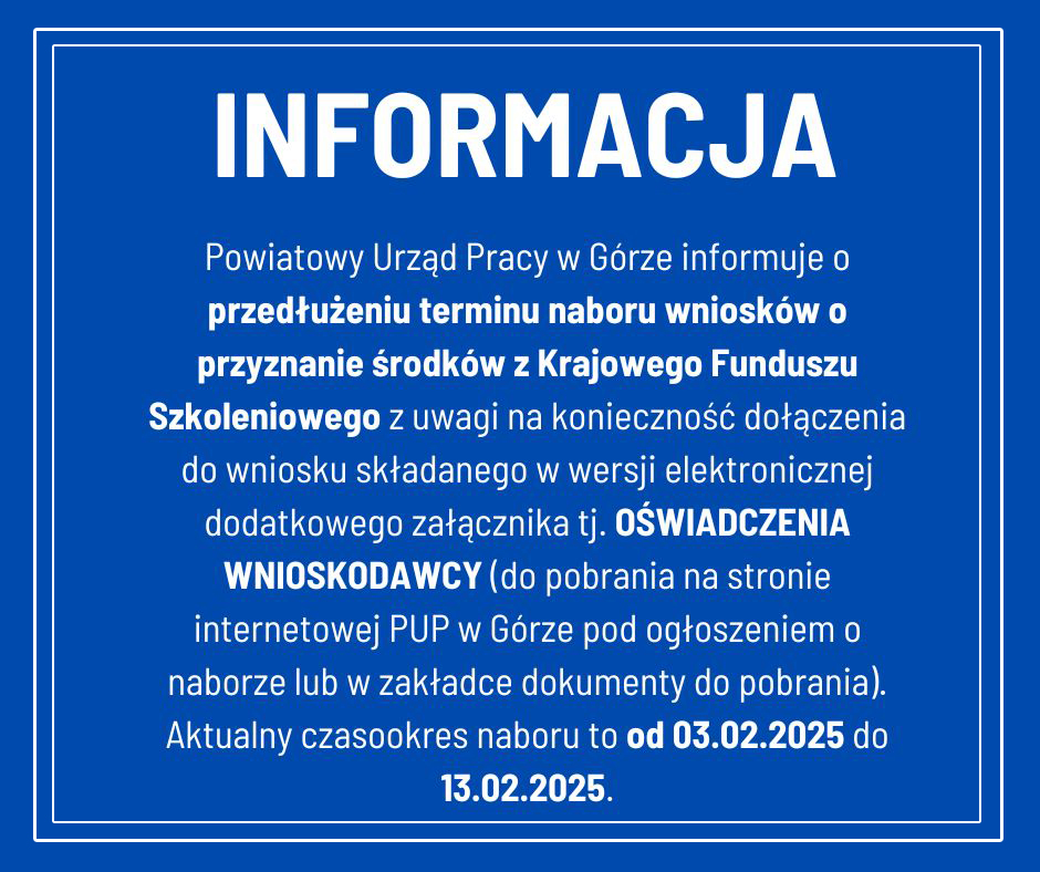Powiatowy Urząd Pracy w Górze informuje o przedłużeniu terminu naboru wniosków o przyznanie środków z Krajowego Funduszu Szkoleniowego z uwagi na konieczność dołączenia do wniosku składanego w wersji elektronicznej dodatkowego załącznika tj. OŚWIADCZENIA WNIOSKODAWCY (do pobrania na stronie internetowej PUP w Górze pod ogłoszeniem o naborze lub w zakładce dokumenty do pobrania). Aktualny czasookres naboru to od 03.02.2025 do 13.02.2025