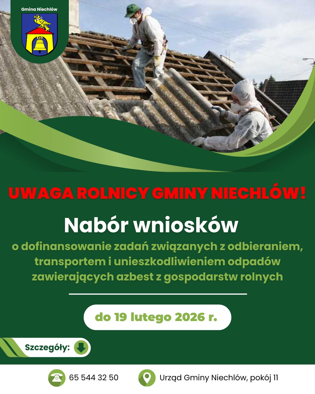 📣 Wójt Gminy Niechlów ogłasza nabór wniosków o dofinansowanie zadań związanych z odbieraniem, transportem i unieszkodliwieniem odpadów zawierających azbest z gospodarstw rolnych znajdujących się na terenie gminy Niechlów.