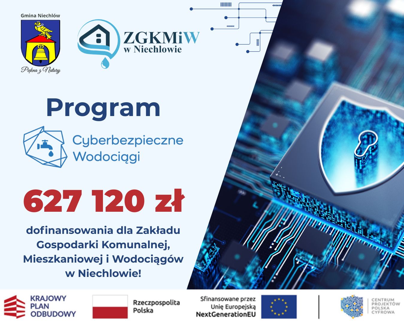 Mamy świetną wiadomość dla mieszkańców! Zakład Gospodarki Komunalnej, Mieszkaniowej i Wodociągów w Niechlowie otrzymał 627 120,00 zł dofinansowania w ramach programu „Cyberbezpieczne Wodociągi”!💧🔐