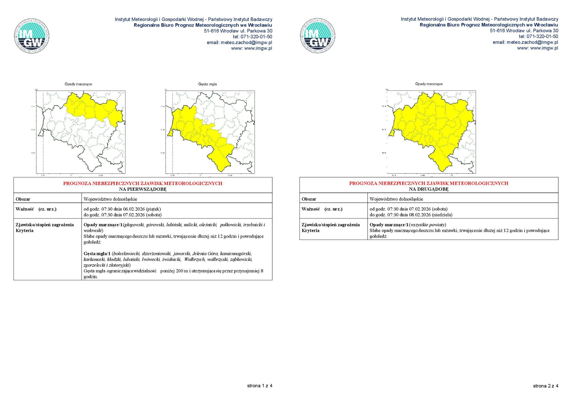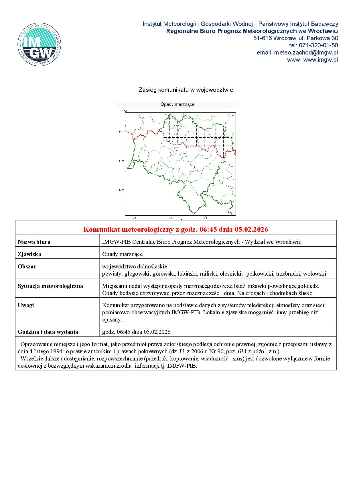 Instytut Meteorologii i Gospodarki Wodnej - IMGW PIB wydał komunikat meteorologiczny dotyczący marznących opadów deszczu bądź mżawki powodujących gołoledź. Opady będą się utrzymywać przez znaczną część dnia. Prosimy o zachowanie ostrożności i zachęcamy do zapoznania się z informacją.