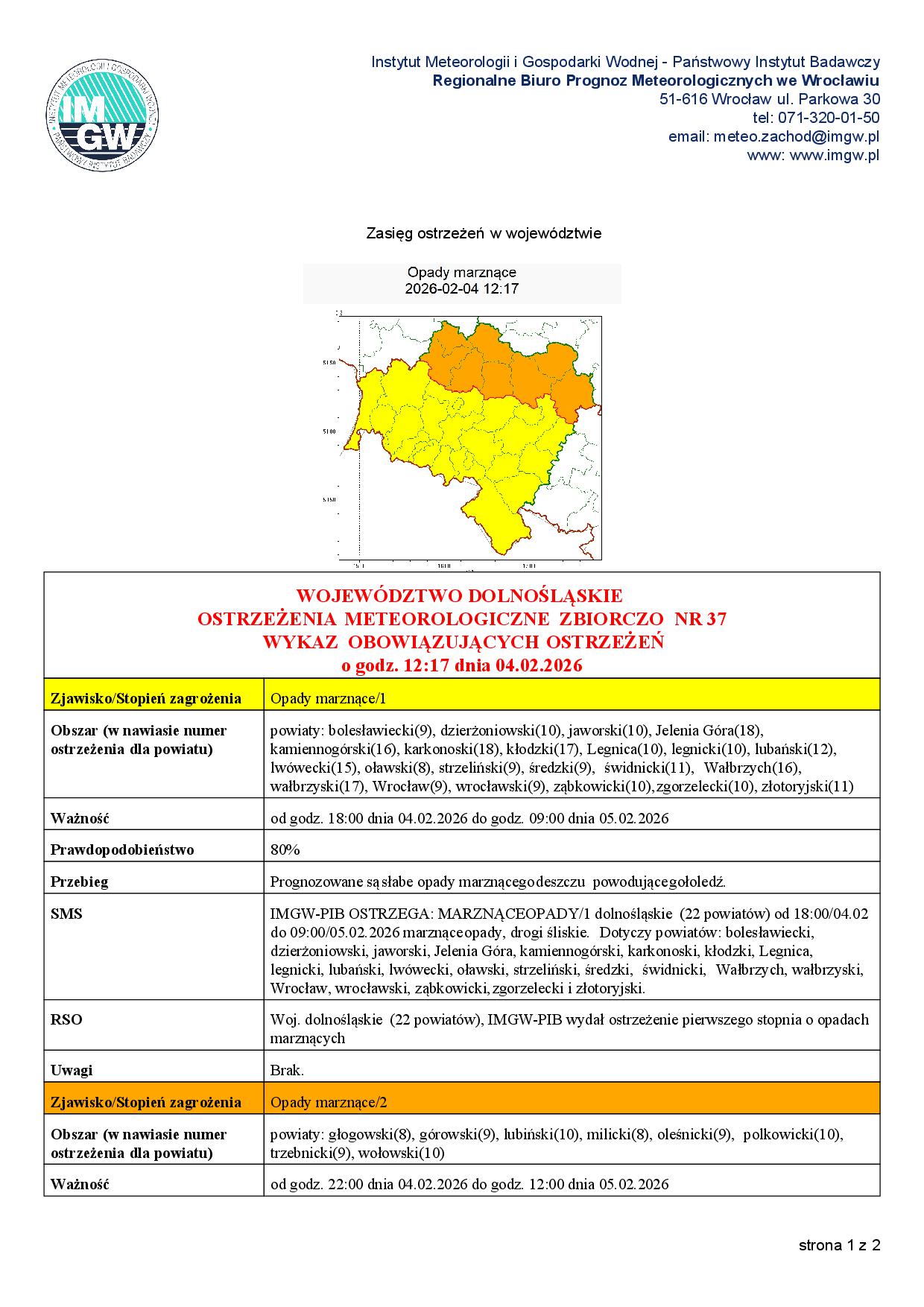 Instytut Meteorologii i Gospodarki Wodnej - IMGW PIB wydał ostrzeżenie drugiego stopnia o opadach marznących dla powiatu górowskiego. Prosimy o zachowanie ostrożności i zachęcamy do zapoznania się z informacją meteorologiczną.