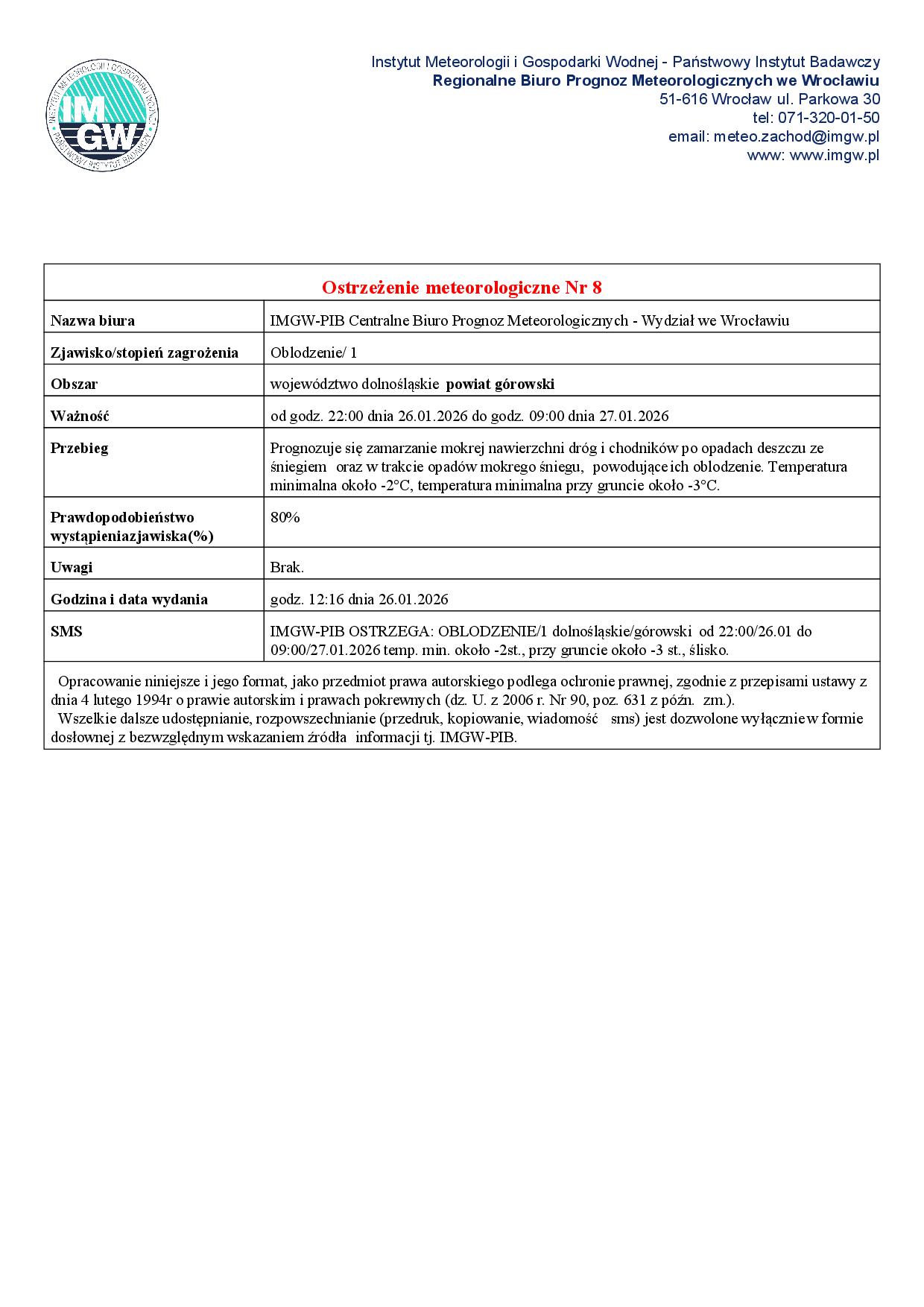 Instytut Meteorologii i Gospodarki Wodnej wydał ostrzeżenie dla województwa dolnośląskiego dotyczące oblodzeń. Prosimy o zachowanie ostrożności oraz zachęcamy do zapoznania się z informacją.