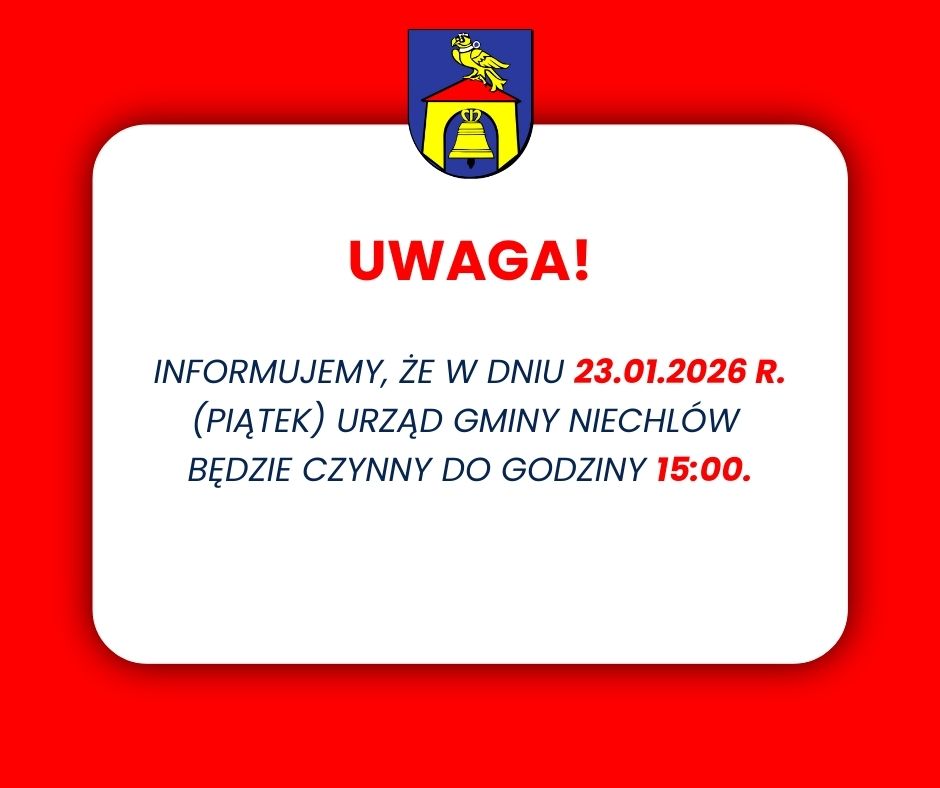 📣 Informujemy, że w dniu 21 stycznia 2026 r. (środa) Kasa Urzędu oraz Biuro Ewidencji Ludności i Dowodów Osobistych będą nieczynne z powodu planowanych wyłączeń prądu.