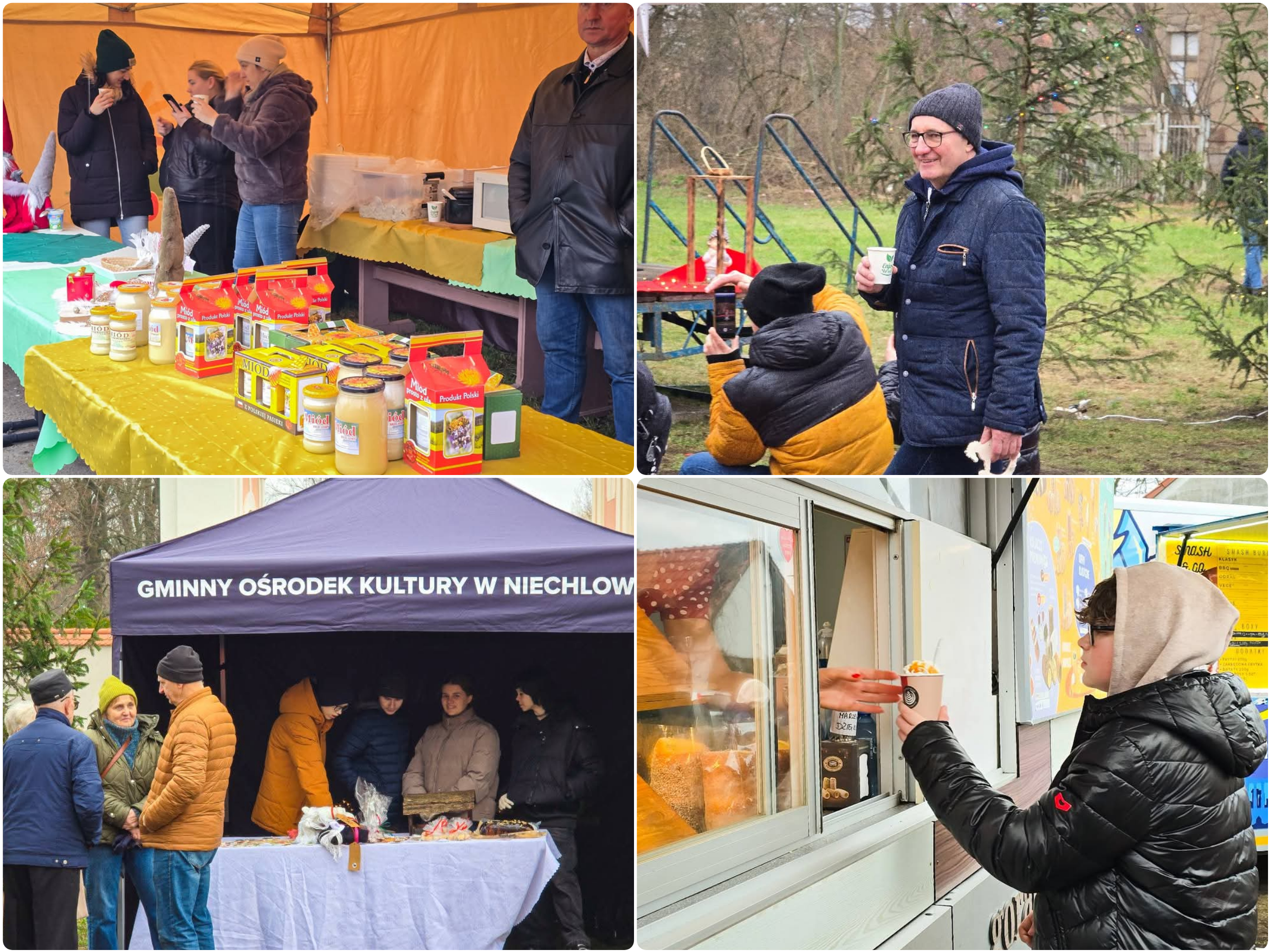Jarmarkowe stoiska obfitowały w świąteczne ciasta, pierniki, kołacze i inne słodkości. Nie zabrakło gorących napojów, słonych przekąsek, barszczu i pierogów! Wystawcy oferowali także lokalne miody i artystyczne rękodzieło, a chętni mogli także upiec kiełbaski przy ognisku.