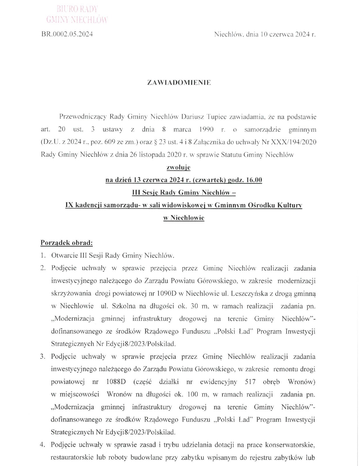 Wymagane dokumenty należy złożyć do dnia 26 czerwca 2024 r. do godz. 13:00 lub osobiście w sekretariacie Urzędu Gminy Niechlów, pok. nr 14.
