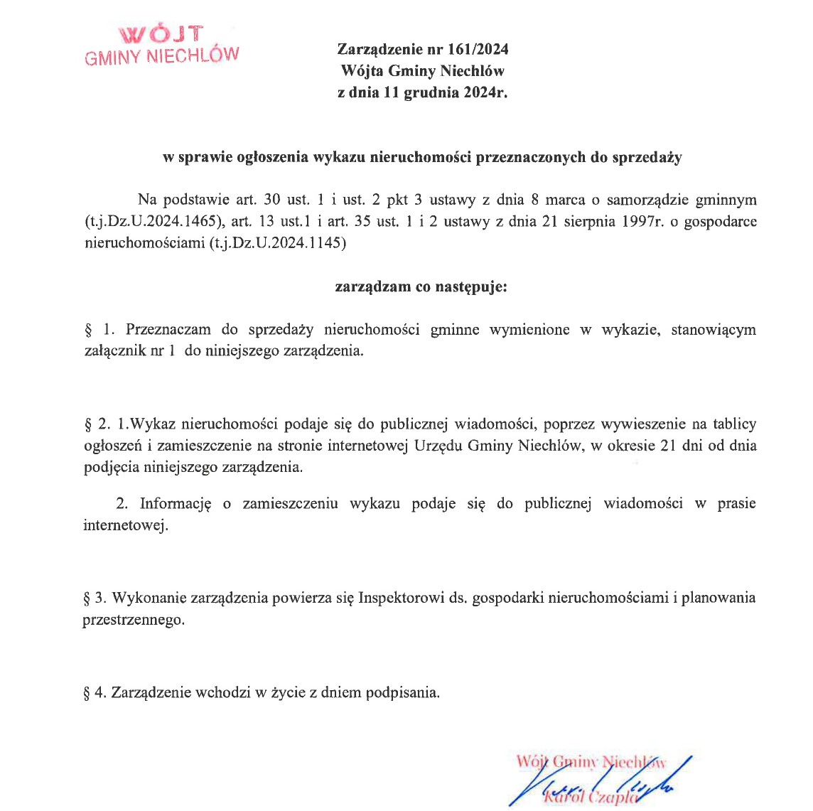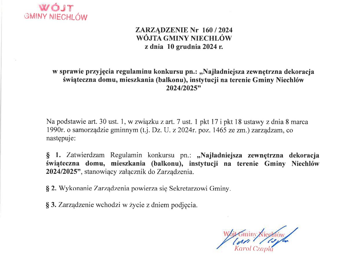 Zarządzenie nr 160/2024 Wójta Gminy Niechlów w sprawie przyjęcia regulaminu konkursu