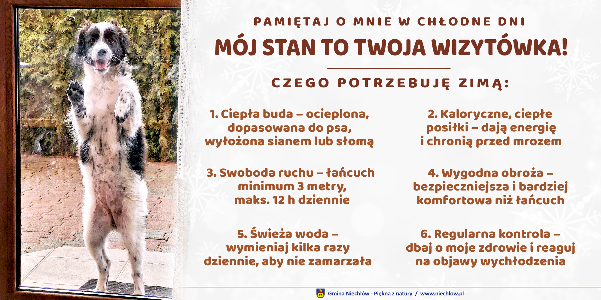 Szanowni Państwo, przypominamy o obowiązku zapewnienia psom przebywającym na zewnątrz odpowiednich warunków, które pozwolą im bezpiecznie przetrwać zimę. Pamiętaj - dobrostan Twojego psa to Twoja wizytówka!